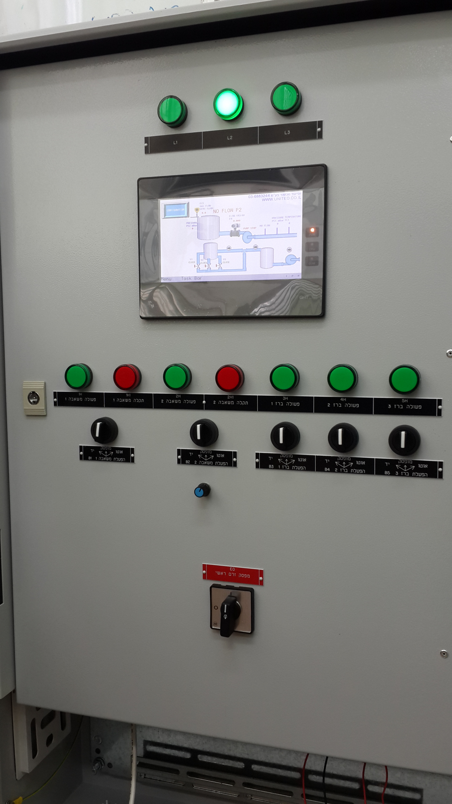 דוגמה של ארון לבקרת משאבות הכולל רגשים שונים כגון : רגשי לחץ , רגשי טמפרטורה , מד זרימה מגנטי למים ומד זרימה לגזים תוצרת FCI